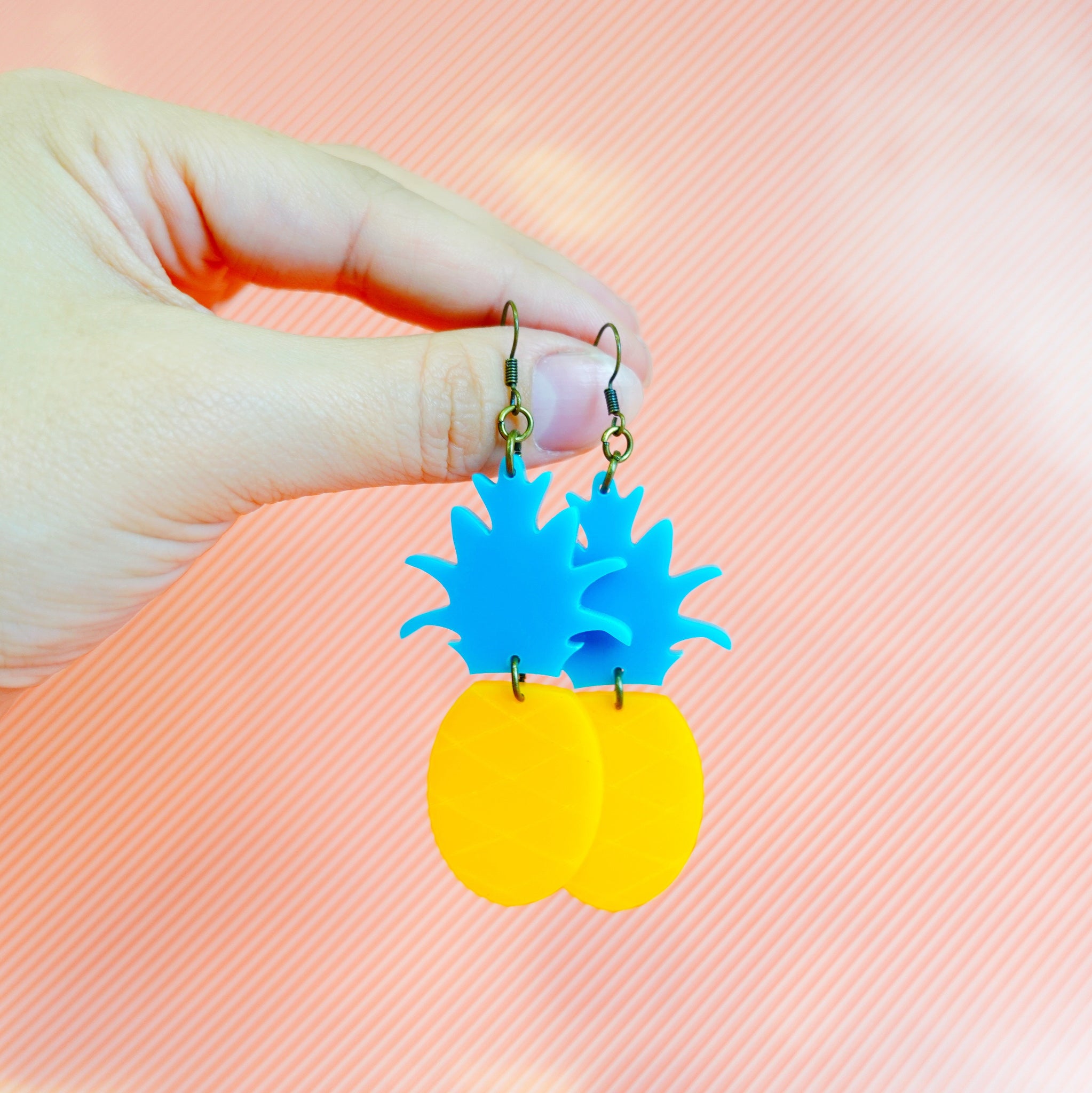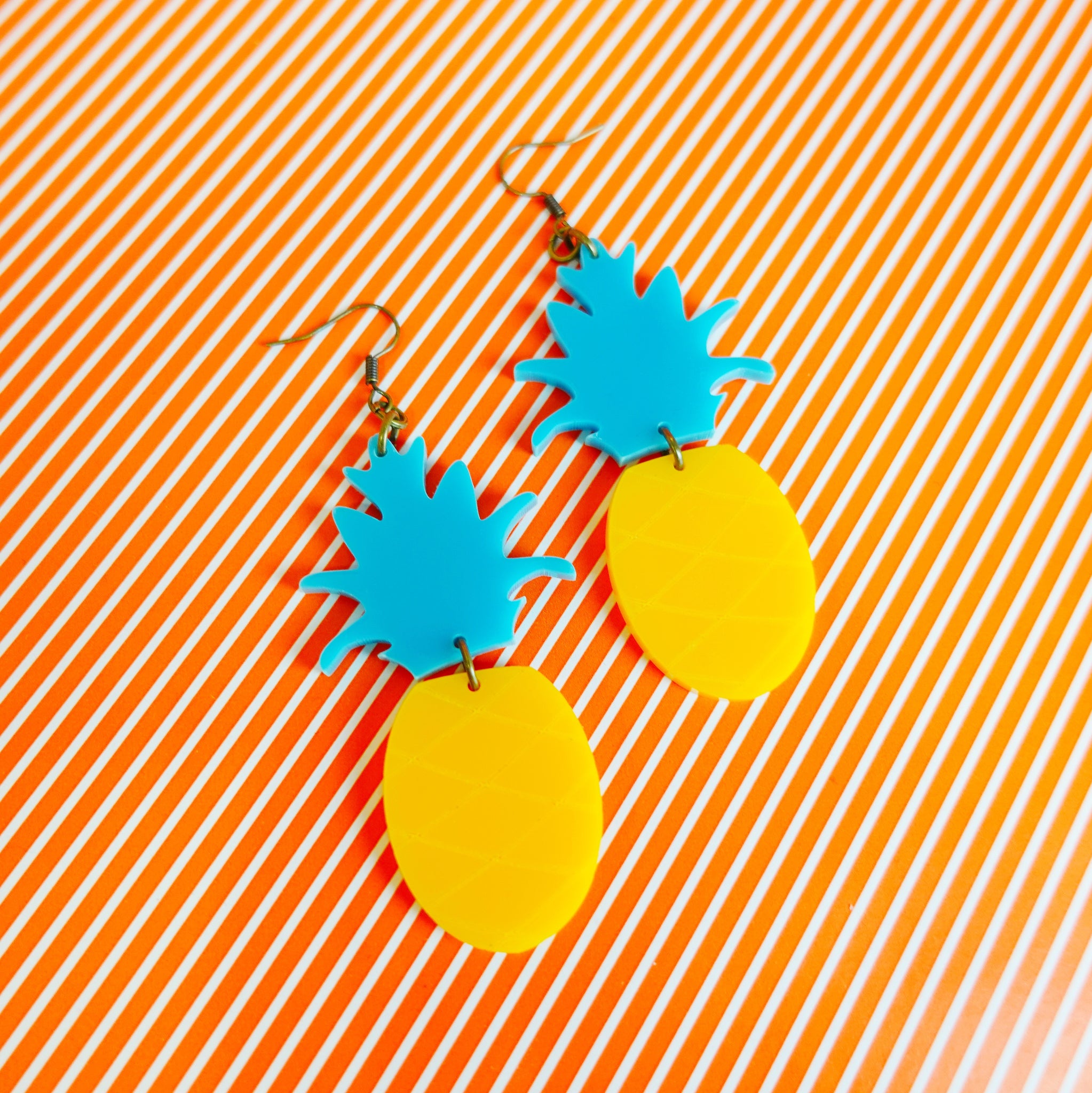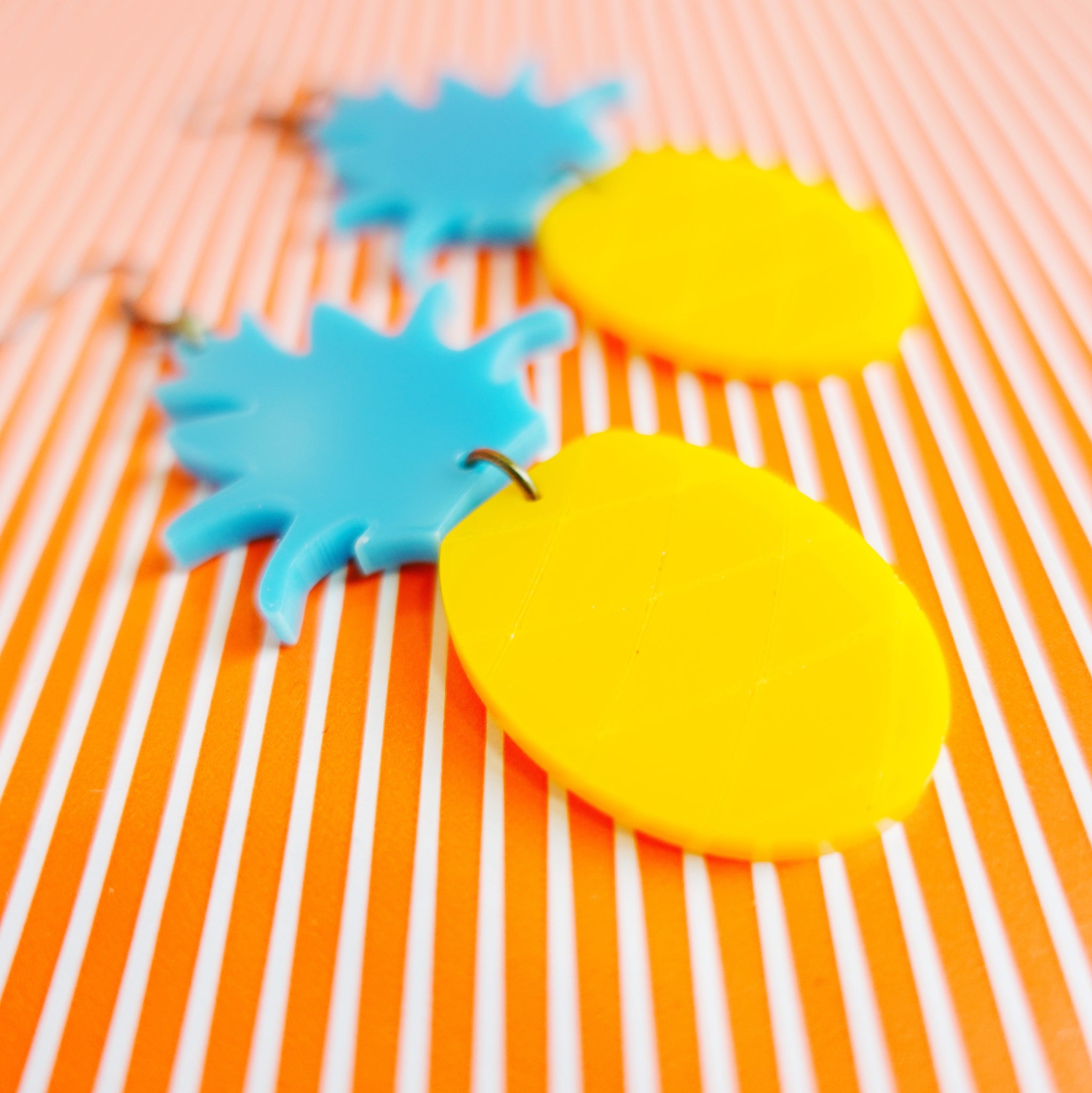 Pineapple statement earrings, engraved, cut from glossy yellow and teal acrylic and hanging from an iron earring hook - nickel free for sensitive skin.