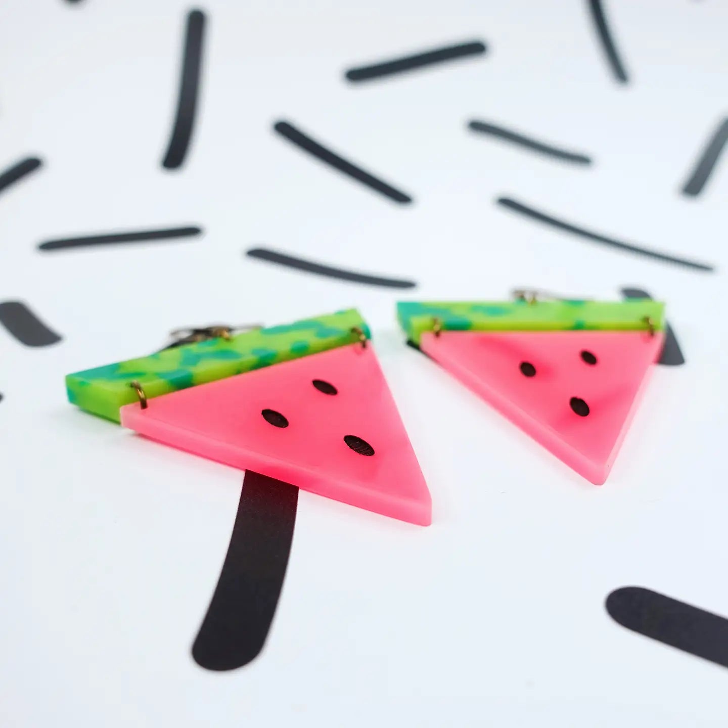 - One piece is cut from glossy neon pink acrylic with engraved and hand painted seed detail, the other piece is made from our own 100% recycled acrylic mixing two colours of green offcuts to create the dual coloured effect of the watermelon rind.