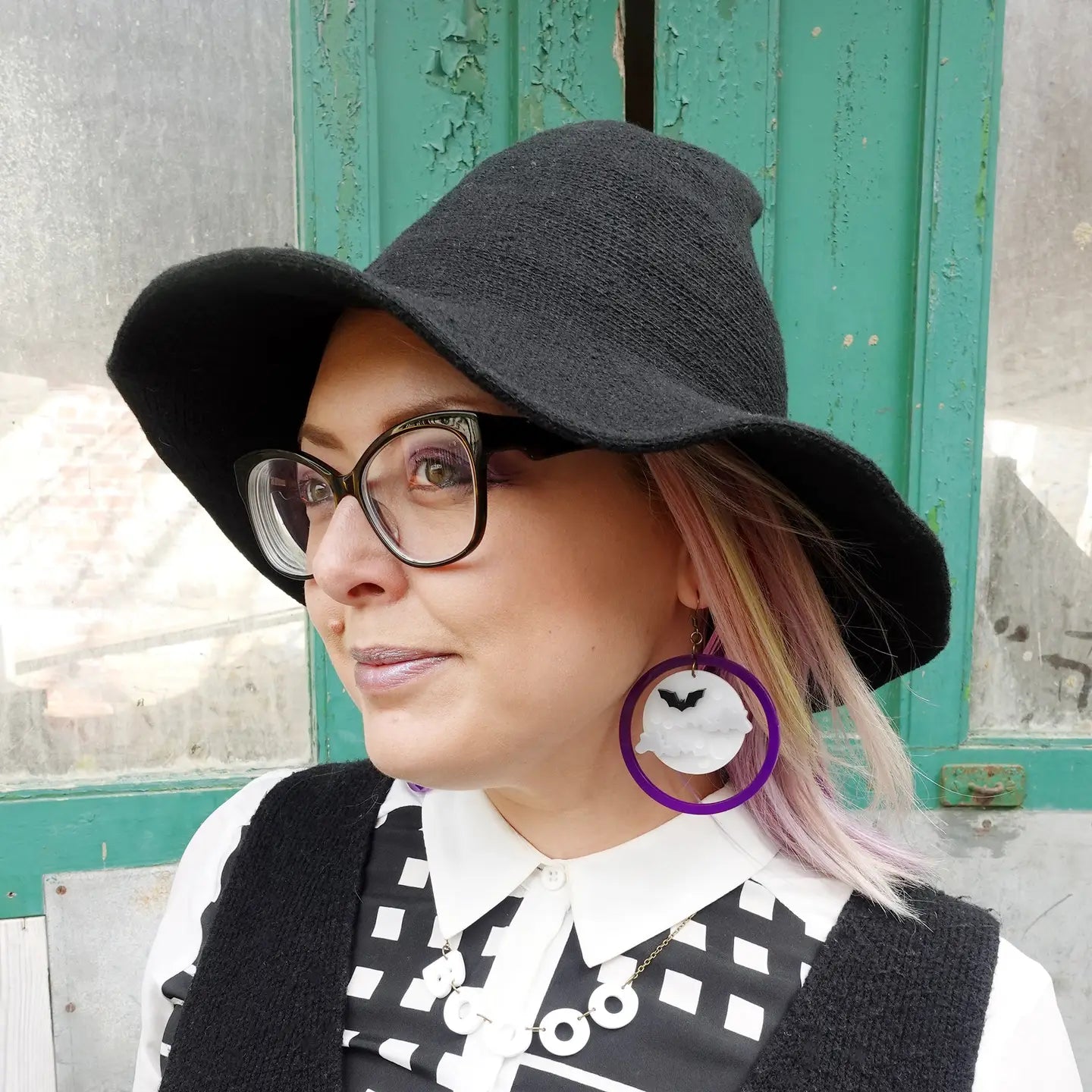 ARGH! My classic weather earrings have been haunted and have turned into these creepy moon sky earrings for Halloween!! Featuring a bat silhouetted against a creamy moon as golden mirrored clouds roll on past, encircled by a bright orange hoop.