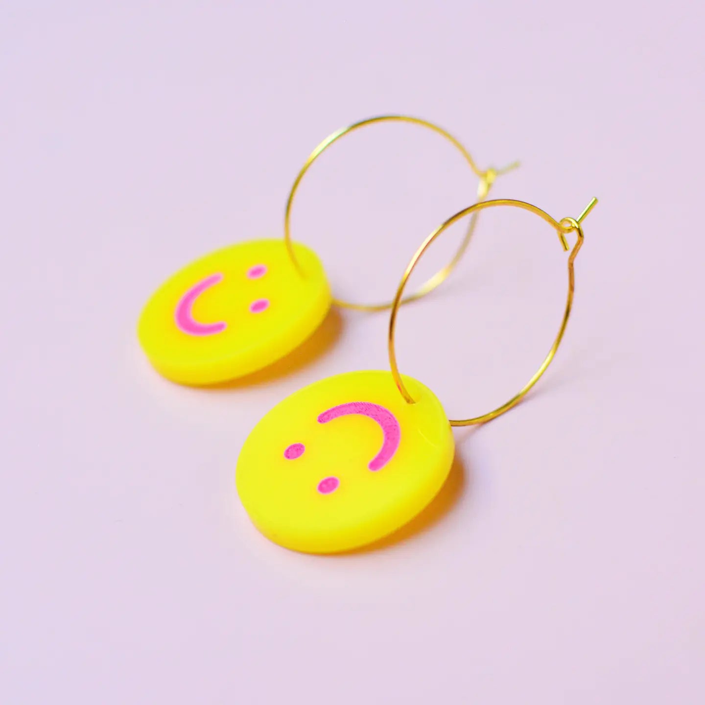 The classic happy face emoji design hanging from a delicate gold coloured hoop. The design features a smiling yellow face on one side and an upside down smiling face on the other - both with engraved detail that is hand painted in neon pink.