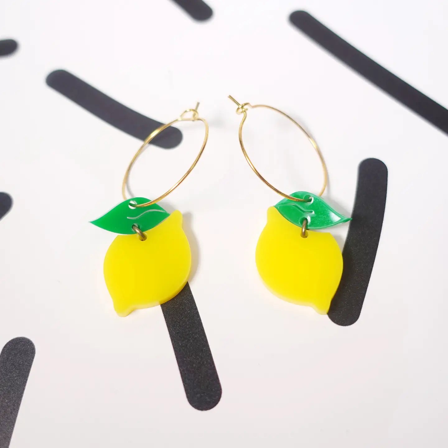 A zesty lemon design hanging from a delicate gold coloured hoop. The design features a glossy yellow lemon shape, complete with a bright green leaf.