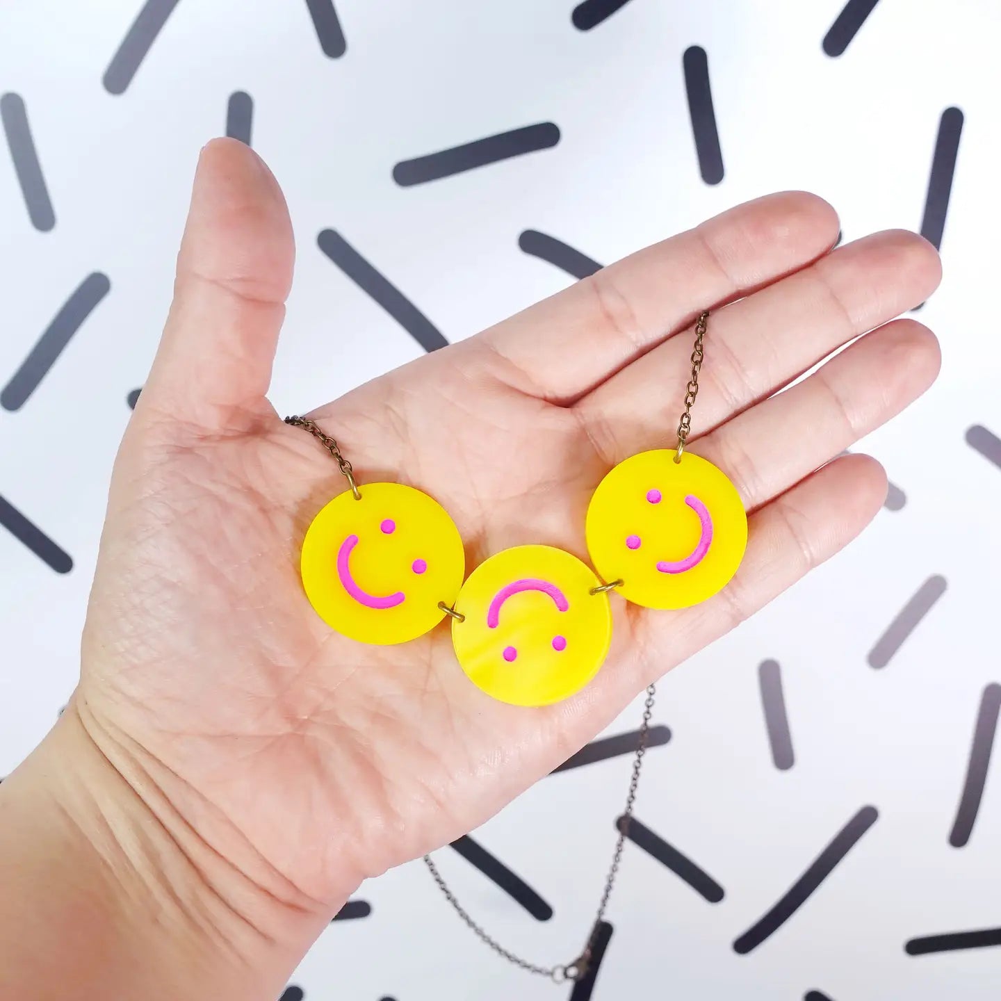 Dimensions: The Rolling Face Emoji Necklace measures 8.9cm x 2.9cm, hanging on a 45cm chain.