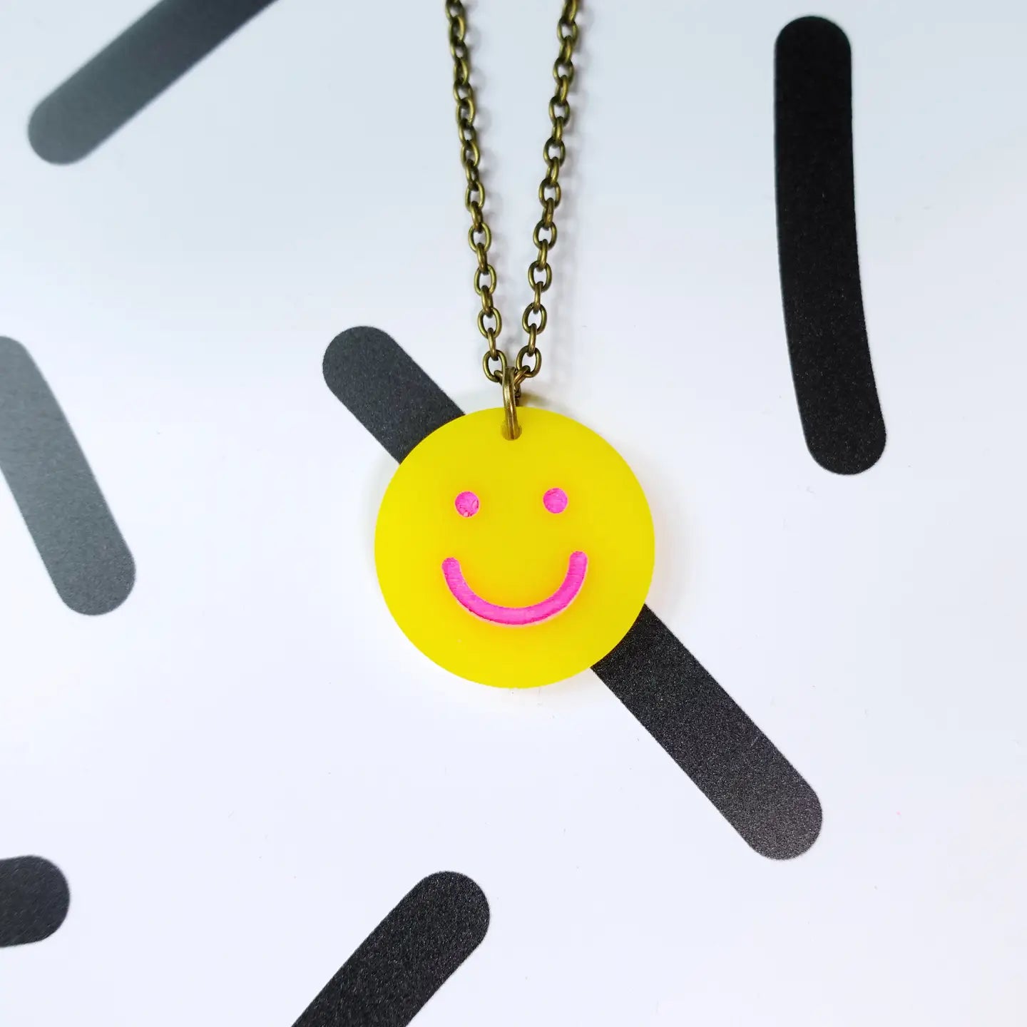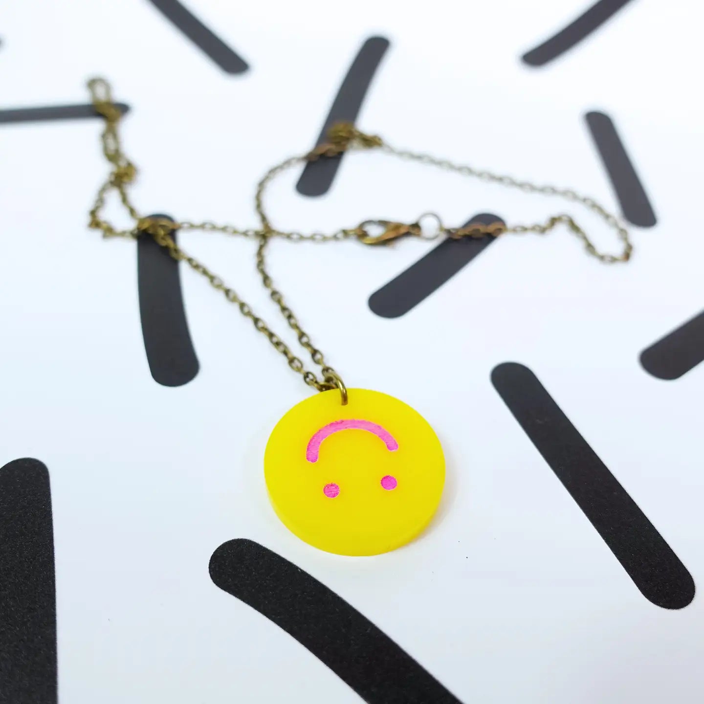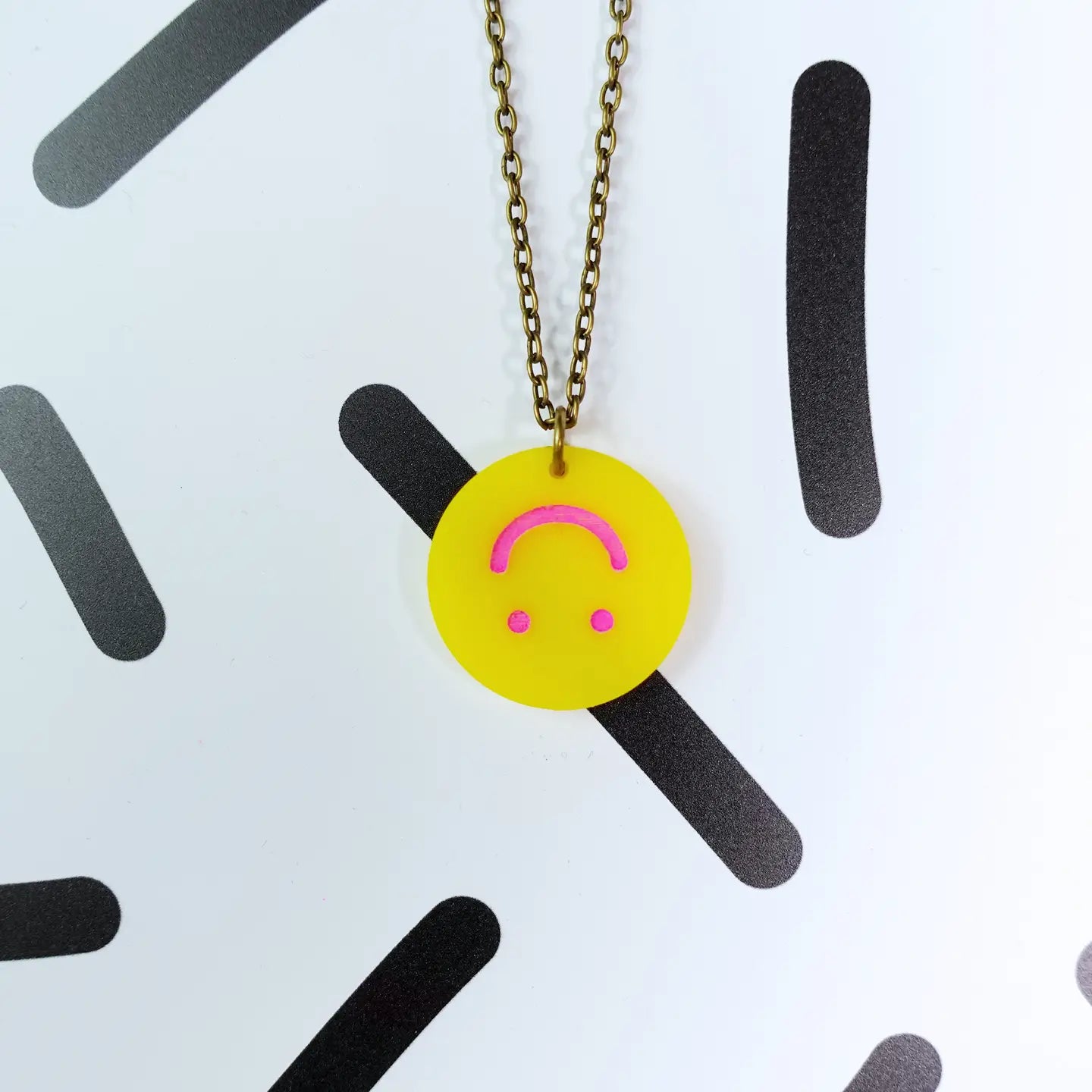 Inspired by the popular millennial face emojis, a disc with a happy face hangs from a gold coloured chain. The design features a glossy yellow circle shape with engraved detail that is hand painted in a neon pink, reminiscent of 90s raves.