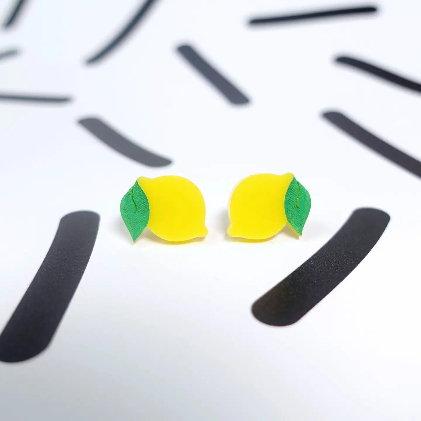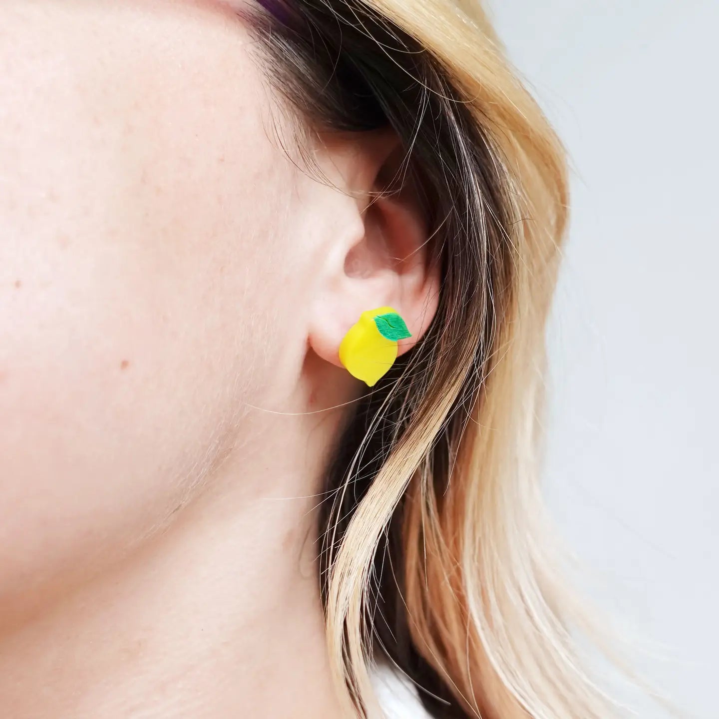 Super fresh and fruity lemon stud earrings featuring a glossy yellow lemon shape with a little green leaf.