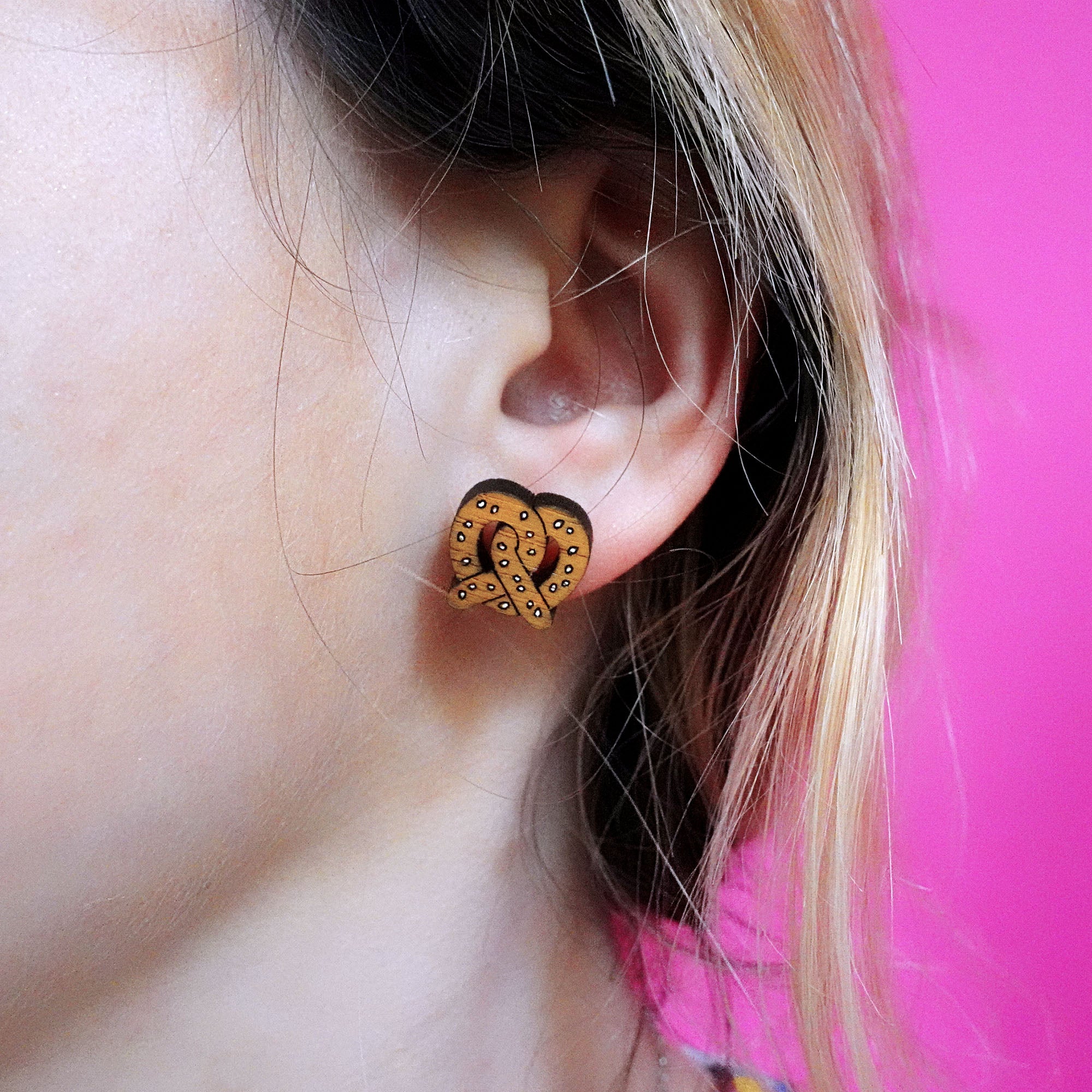 Made from FSC sustainable wood, these pretzel studs are fixed to hypoallergenic stainless steel earring posts - perfect for sensitive skin! Each pair is supplied with rubber earring backs.